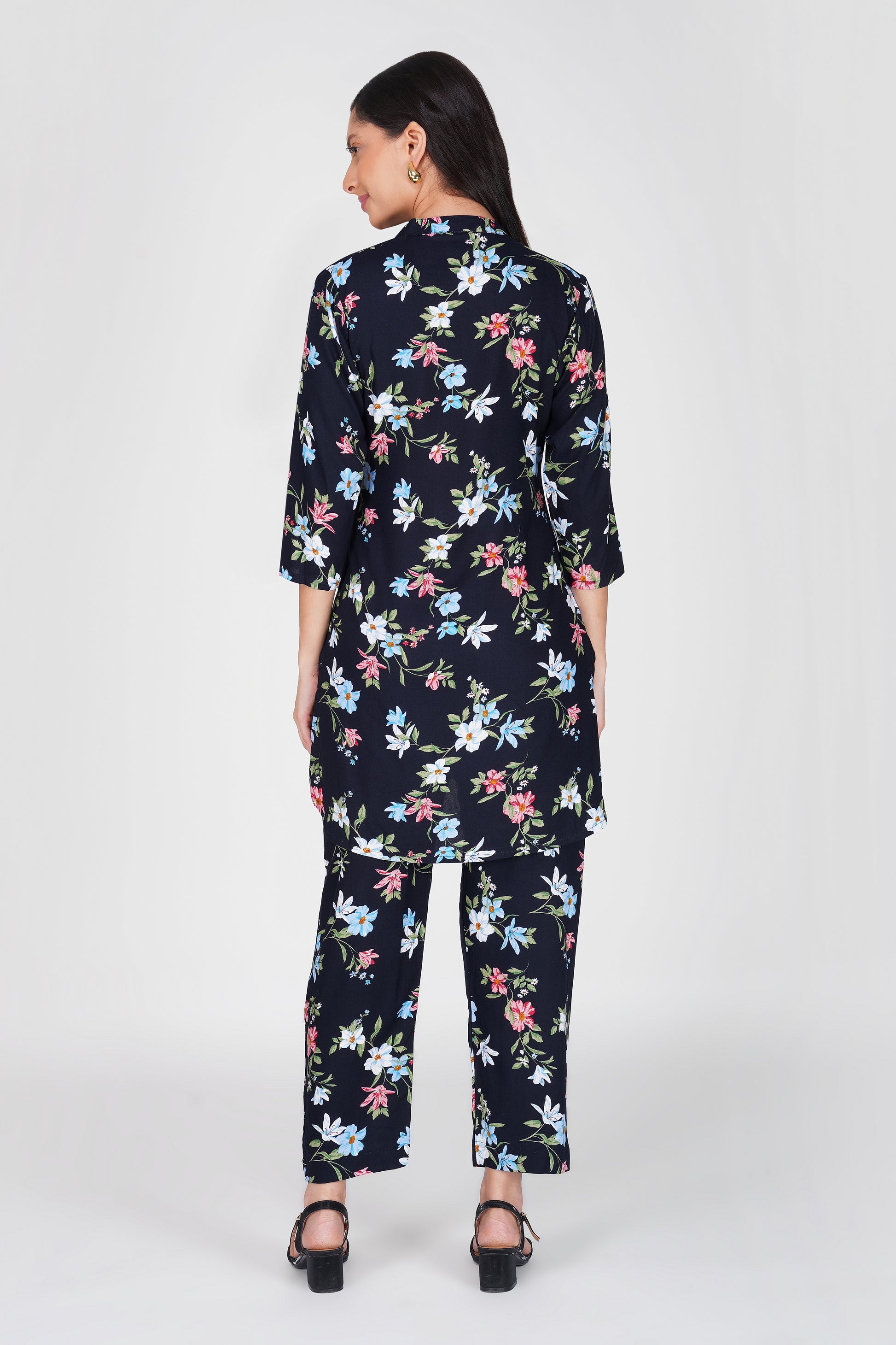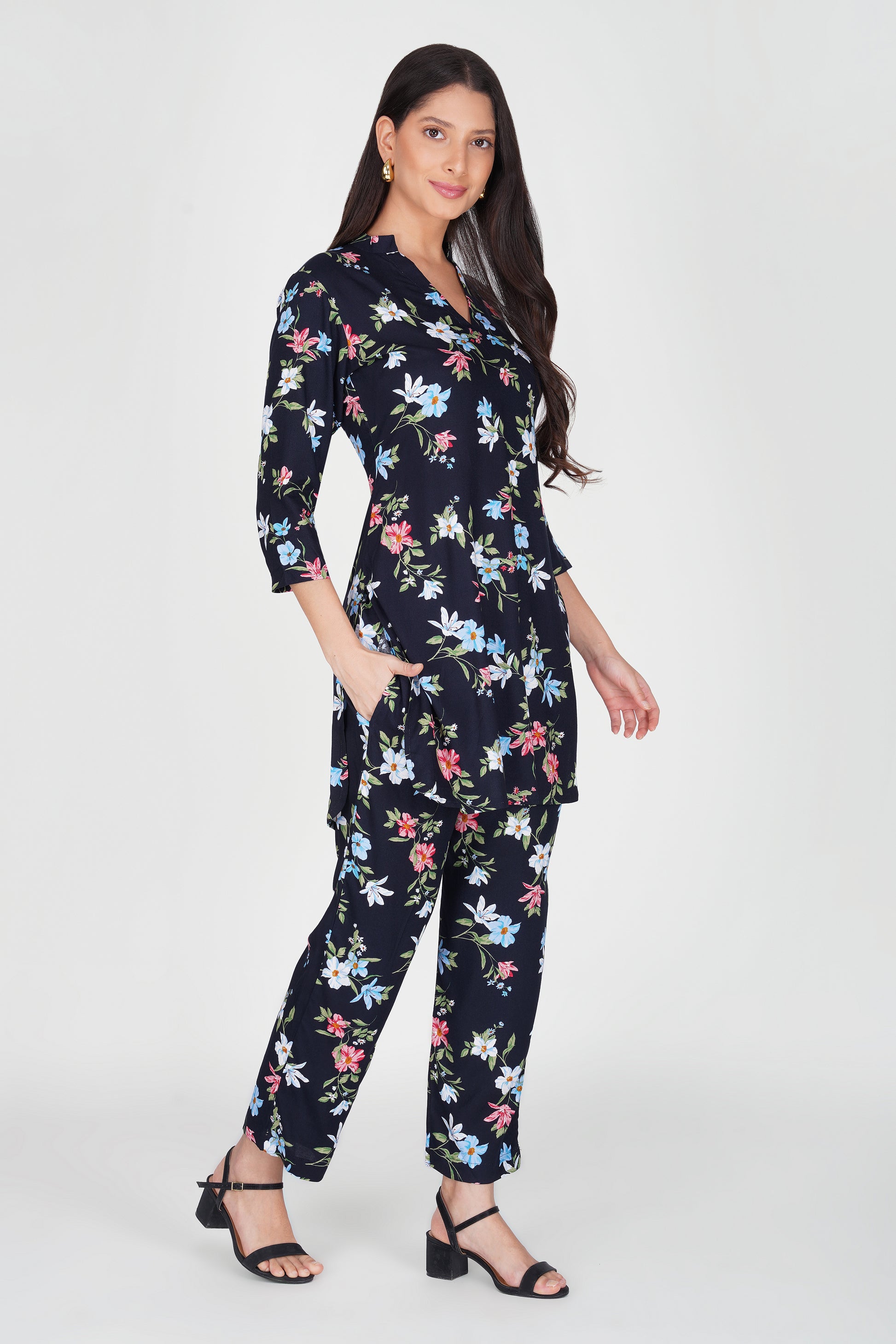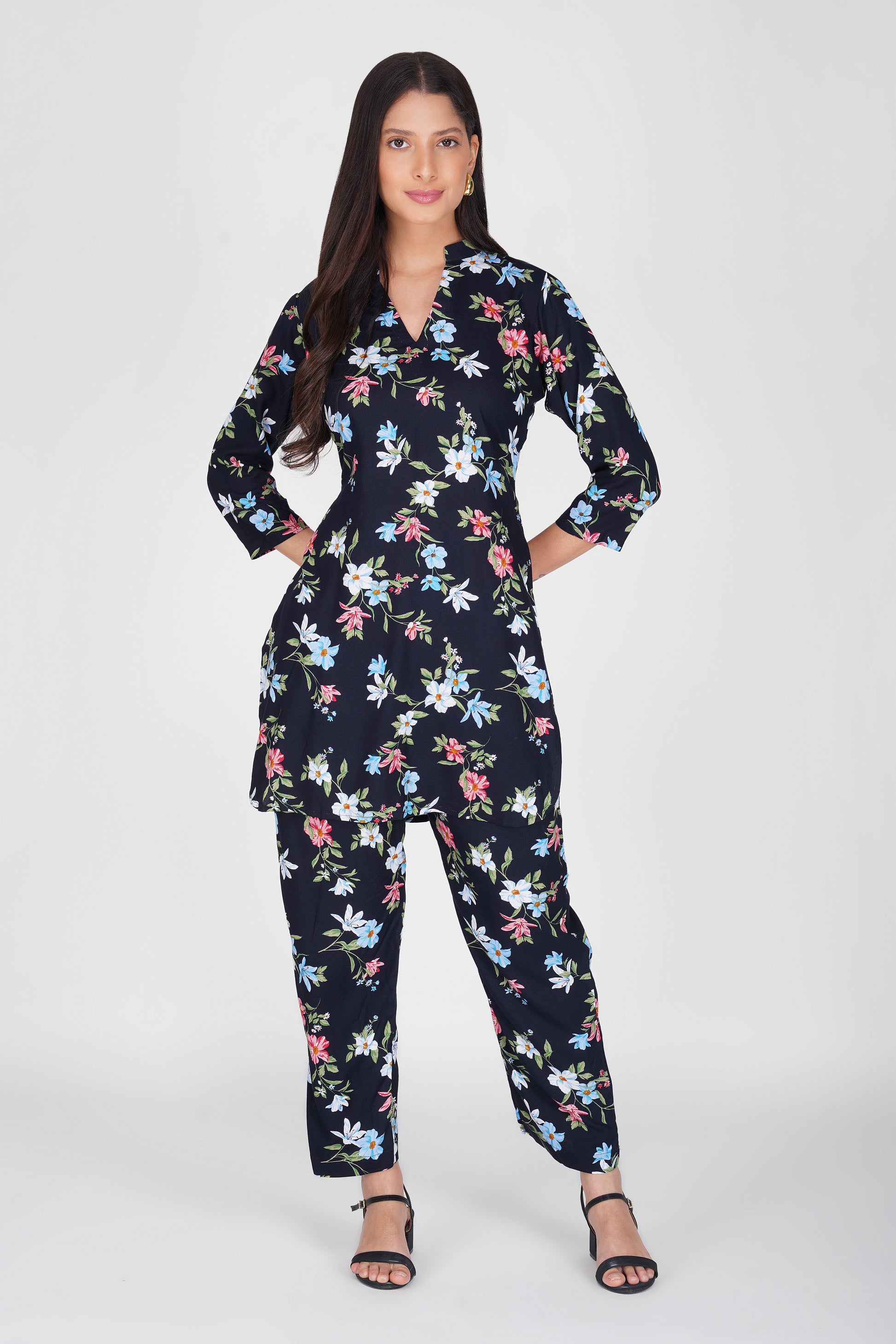the Midnight Bloom Kurti Set — your floral ticket to everyday magic. Bathed in deep midnight blue and bursting with vivid floral splashes, this set brings all the romantic, trend-right energy you crave. The sleek V-neck kurta and comfy straight-leg pants make it a breeze to wear from busy mornings to breezy evenings. With soft, airy fabric, it’s just as perfect for workdays as weekend escapes.