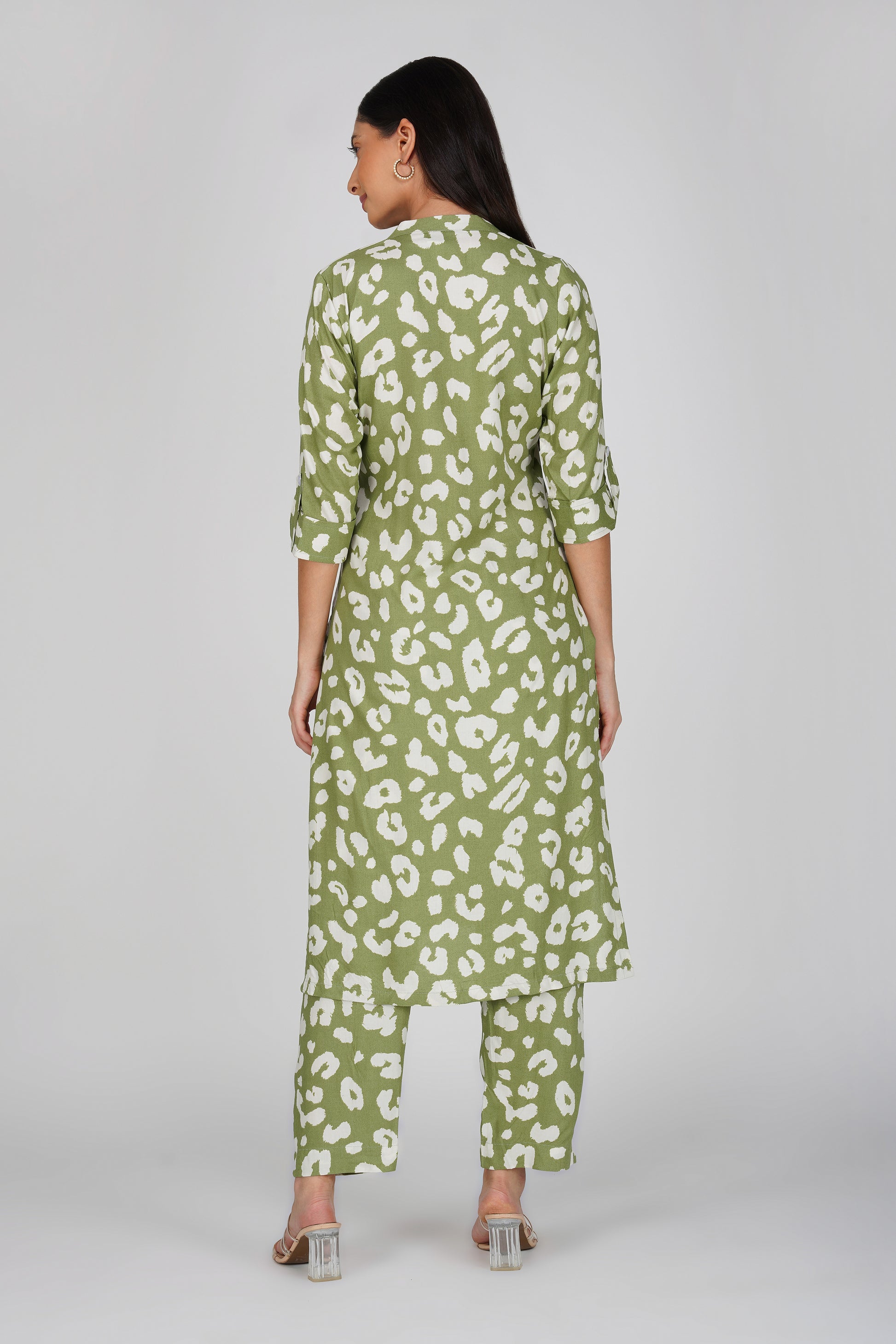 Step into bold sophistication with our Olive Green Animal Print Co-ord Set – a statement-making blend of playful energy and effortless elegance. The fresh olive hue with white abstract animal spots brings a modern twist to classic co-ords, perfect for the woman who owns her style.