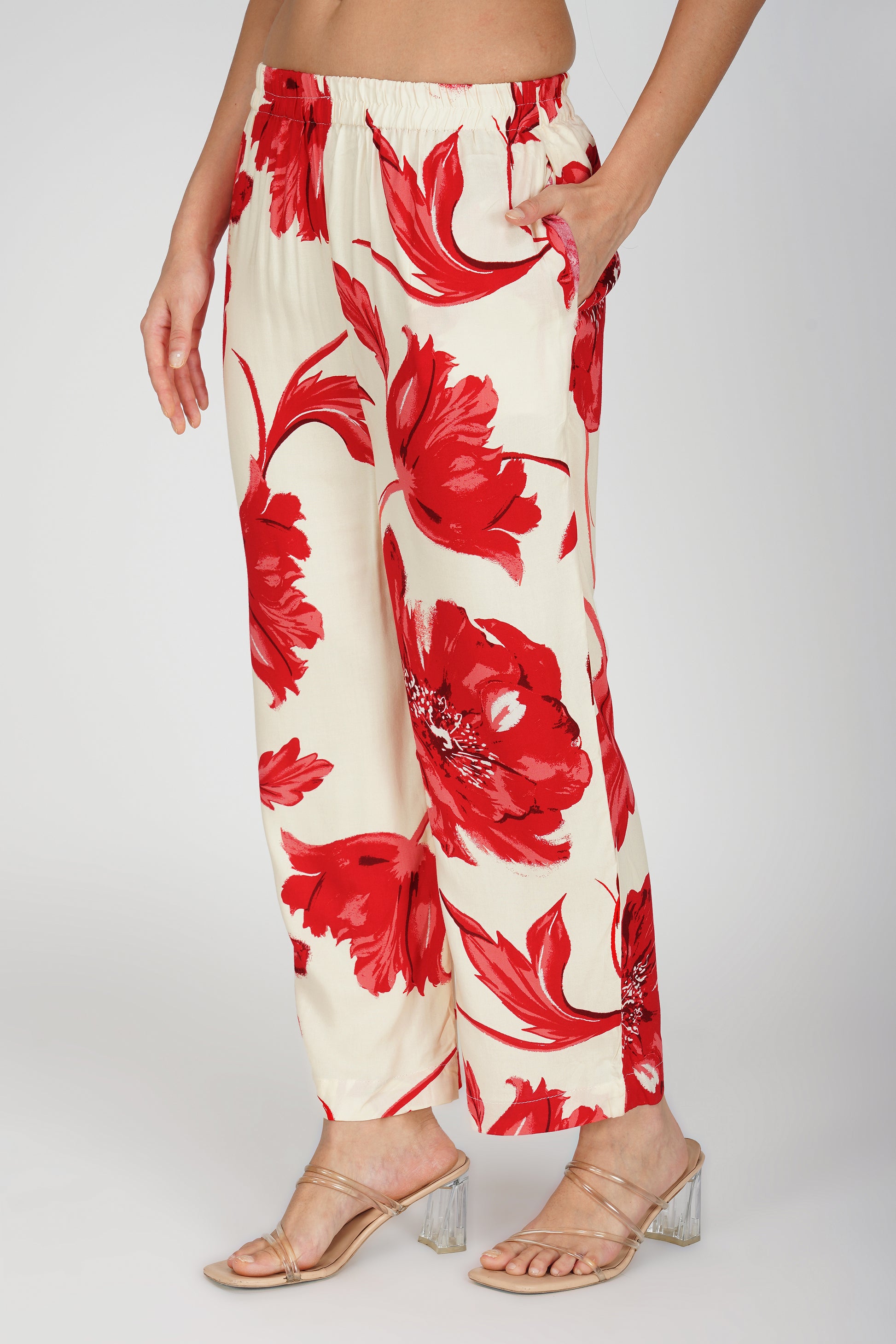 The bold red floral print blooms beautifully against the serene ivory base, making a statement without saying a word. Whether it’s a brunch with friends, a festive gathering, or a casual day out, this outfit ensures all eyes are on you – for all the right reasons.